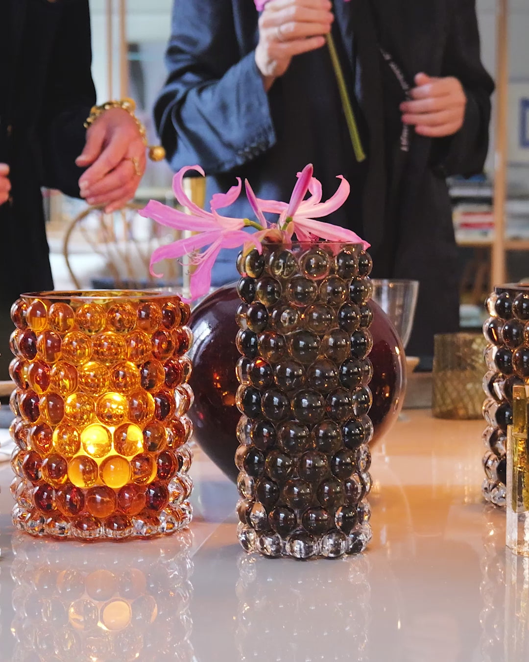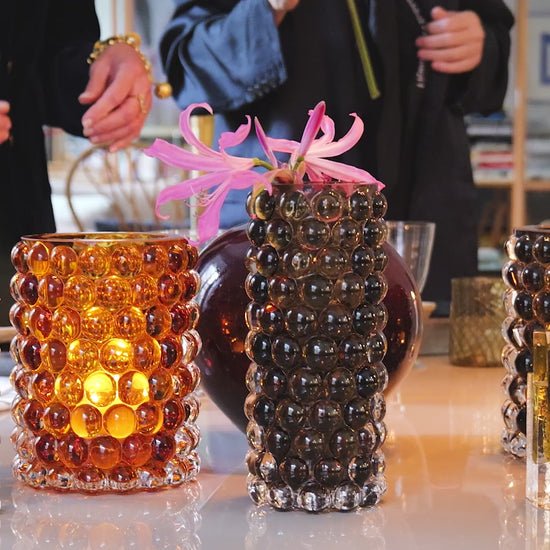 Handblåst i landskapet Böhmen, där världens bästa glasblåsare finns. Bubblorna, skapade i en gjutjärnsform, ger Boule sitt unika optiska mönster och en lyxig tung känsla. Perfekt för blommor, men lika slående tom som ett dekorativt föremål.