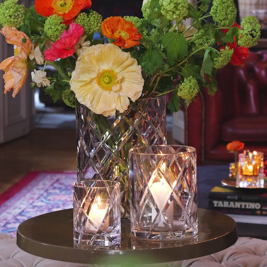 Hurricane Crystal är vår mest exklusiva kollektion och är tillverkad i 100% Böhmisk kristall. Med sina djupa oregelbundna skär, är Crystal en modern och lekfull utveckling av traditionell kristall formgivning. När du tänder din Crystal lykta gnistrar ljuset i alla skären, precis där solen leker på dagen eller fyll den med blommor och ställ mitt på bordet.